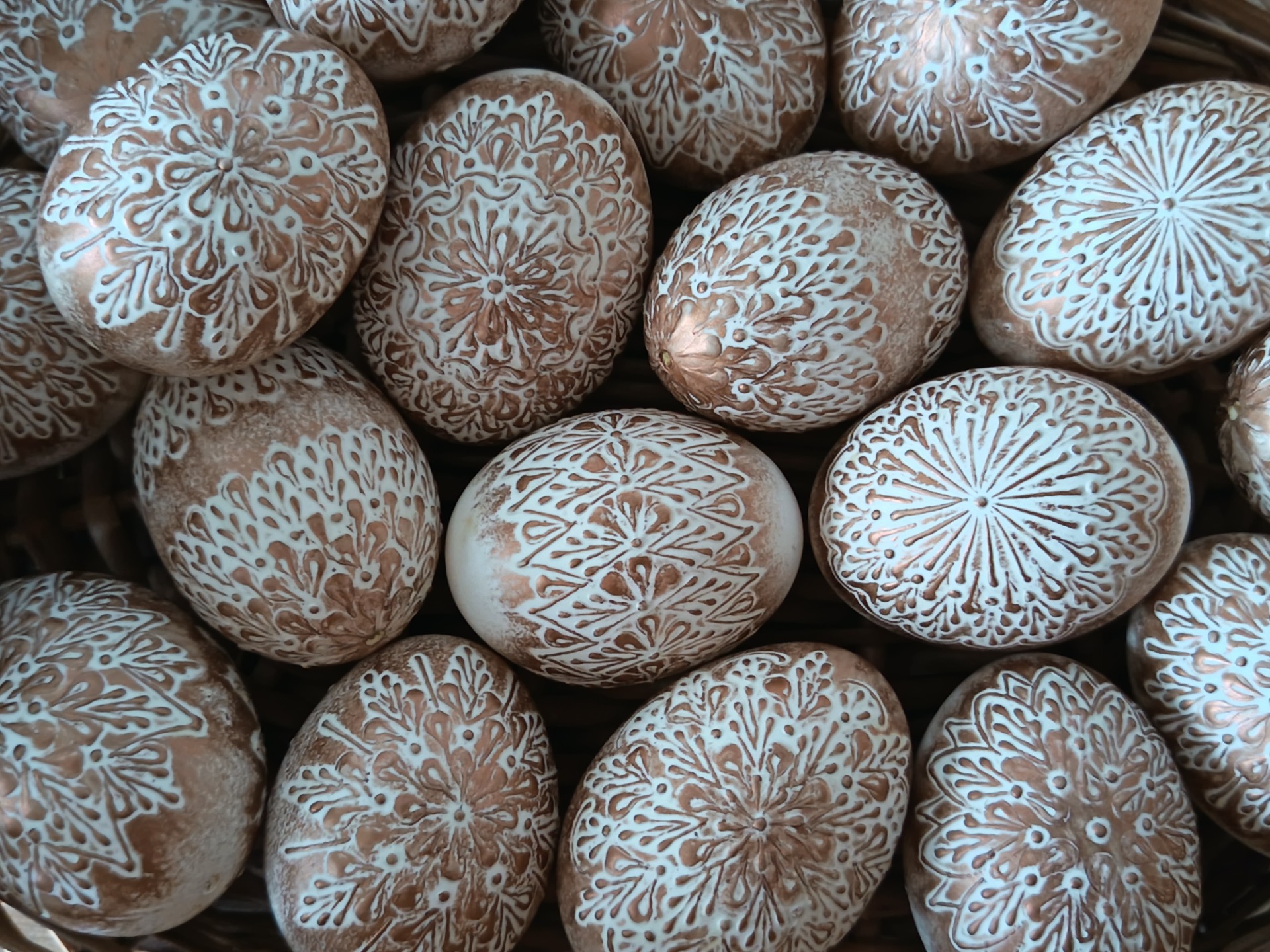 Kraslice malované voskem a patinované voskovou pastou.